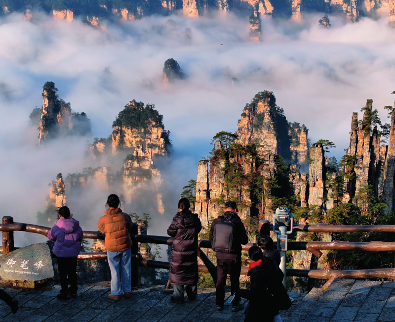 游人在張家界國(guó)家森林公園天子山欣賞云海景觀(2024年1月3 日攝)新華社發(fā)(吳勇兵攝)