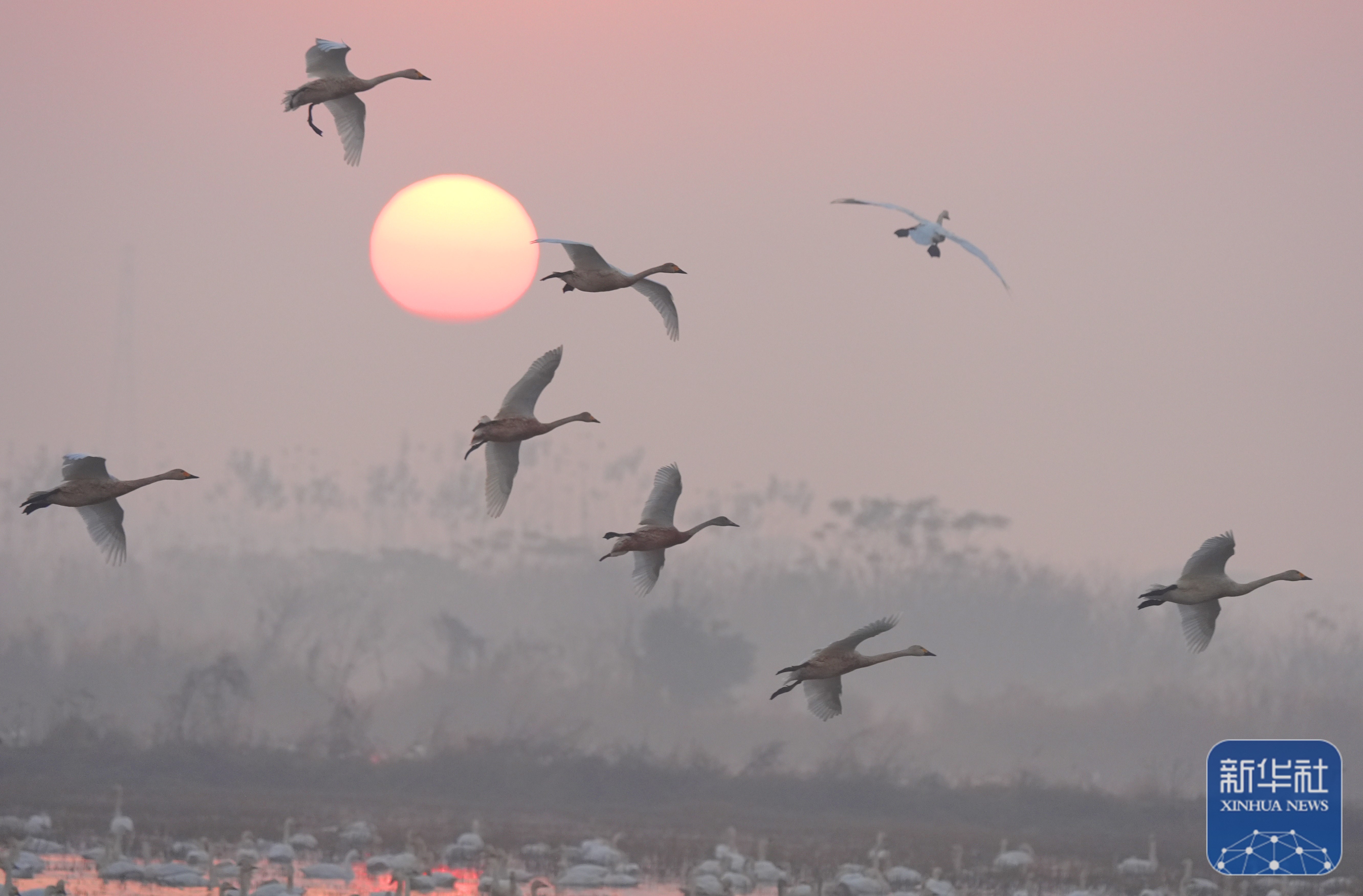 ↑ 12月6日,小天鵝在湖南省岳陽市屈原管理區(qū)東古湖濕地上空飛翔。